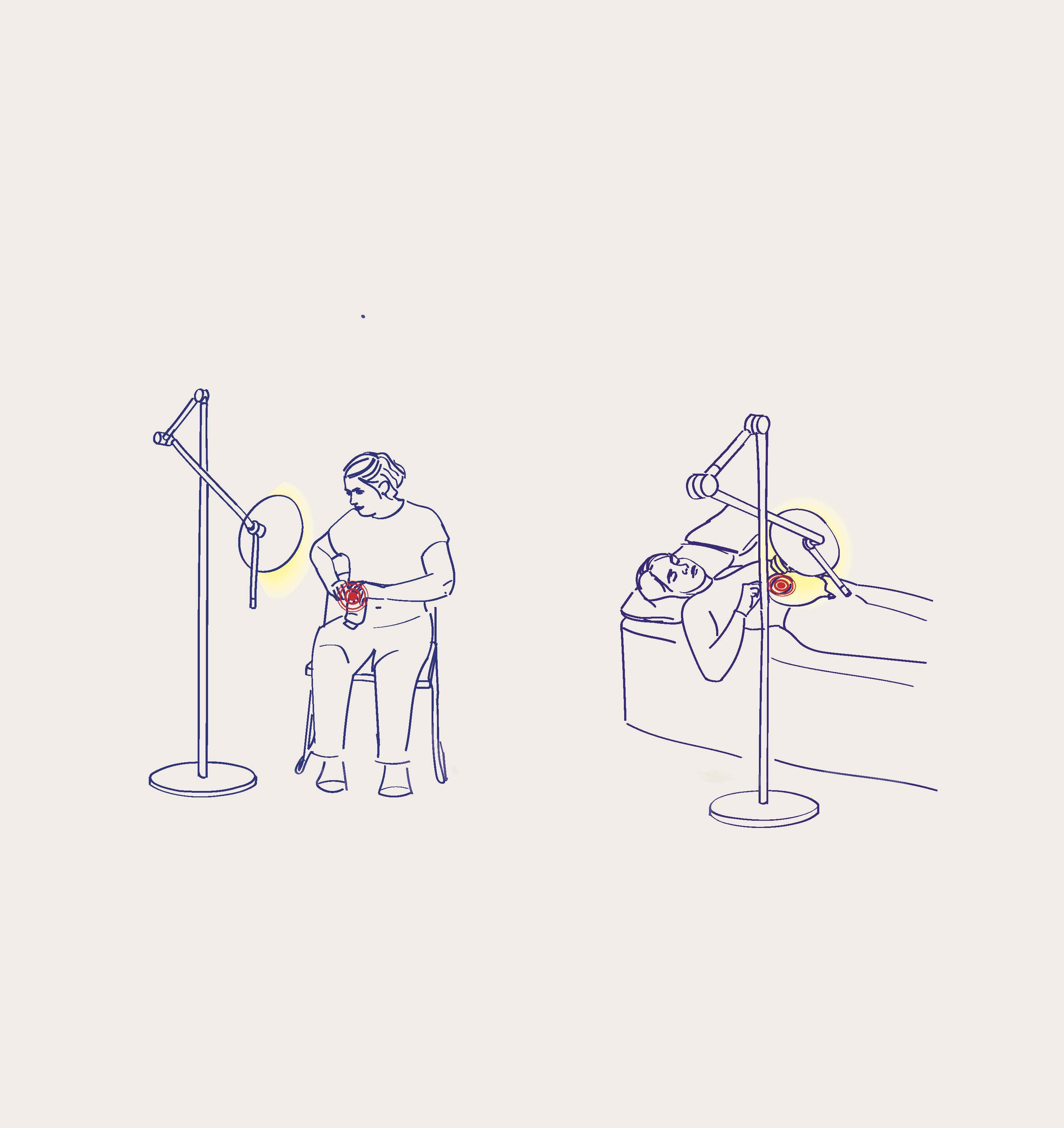 This assistive mirror has an adjustable structure that can be positioned at any height and angle, allowing people to keep their hands free while performing a bag change, whether lying down, sitting, or standing.
